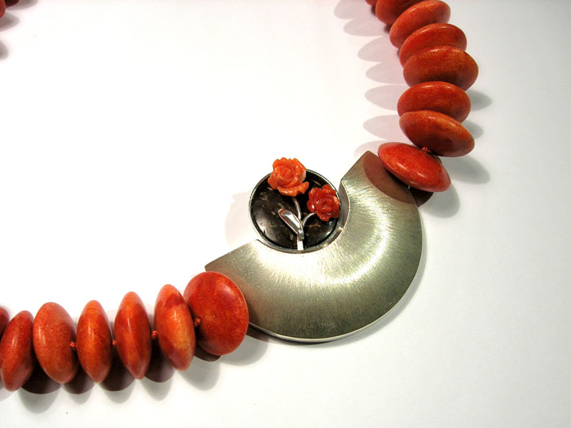 Collierschließe Silber 925 Schwammkoralle, Edelkorallen-Rosen, Kokosnuss-Holz